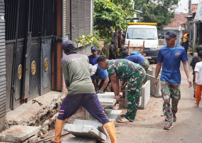 PELITAKOTA.ID: Depok – Langit mendung menyelimuti Kelurahan Sukamaju, Kecamatan Cilodong, Kota Depok, Senin (23/2/2026). Gerimis yang turun siang itu tak menyurutkan langkah personel Satgas TMMD…