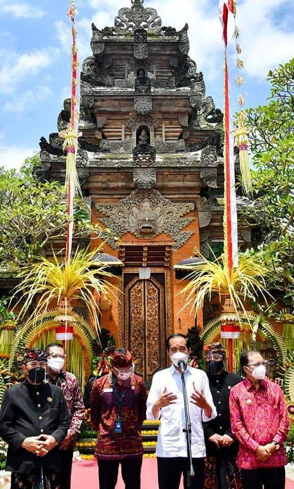 Bali – Pelitakota.Id Presiden Joko Widodo meninjau pelaksanaan vaksinasi Covid-19 secara massal dalam kunjungan kerja ke Provinsi Bali pada Selasa, 16 Maret 2021. Kegiatan vaksinasi massal pada kunjungan tersebut dipusatkan di Puri Saren Agung, Kecamatan Ubud, Kabupaten Gianyar.