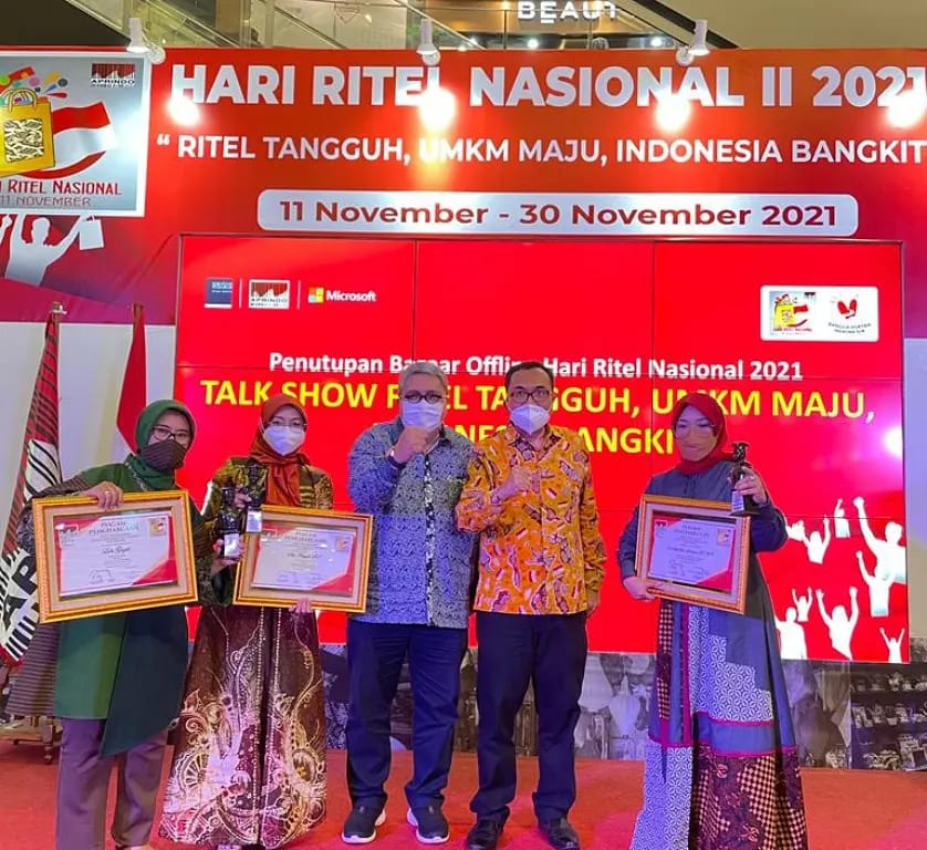 Wakil Mentri Kementrian Perdagangan RI – Jerry Sambuaga didampingi Ketua Umum APRINDO Roy M. Mandey menye-rahkan Piagam Penghargaan dan Piala kepada 2 (dua) UMKM Kota Bekasi untuk Kelas Kecil dan Menegah. Penyerahan Penghargaan diserahkan pada acara Penutupan Hari Ritel Nasional ke 2 pada Selasa, 30 November 2021 di Aeon Mall Jakarta Timur. 2 (dua) UMKM Kota Bekasi penerima Penghargaan UMKM Unggulan Terbaik APRINDO 2021 UMKM Kelas Kecil SITI AISYAH – dengan Produk Baby Healthy Food, untuk Kelas UMKM Kelas Menegah diraih LALA GOZALI – Rumah & Kain Bajoe GIANTI.