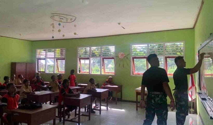Maybrat – Pos Suswa Satgas Pamtas Kewilayahan Yonif 623/BWU memberikan pembekalan Wawasan Kebangsaan (Wasbang) Indonesia kepada siswa-siswi SMPN 1 Mare Distrik Maybrat, Merauke, Papua Barat…