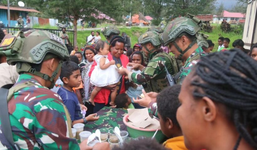 Papua – Satgas Mobile Yonif 323 melaksanakan kegiatan sosial “Minggu Kasih” dengan membagikan makanan berupa Bubur kacang Hijau dan Kue kepada jemaat Gereja Santo Stephanus…