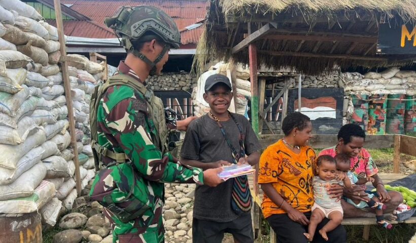PAPUA – Satgas Pamtas Mobile Yonif 323 Kostrad membagikan buku tulis dan alat tulis kepada anak-anak bertempat di Pos Gome, Kab.Puncak, Papua, Selasa (28/05/2024). Danpos…