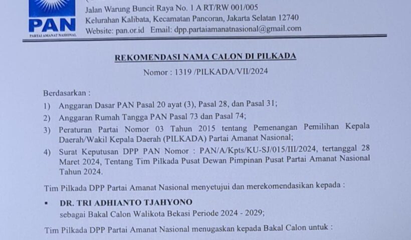 Kota Bekasi – Partai Amanat Nasional dengan Lima Kursi DPRD Rekomendasikan Tri Adhianto Sebagai Bakal Calon Walikota 2024 – 2029. Hal ini termaktub dalam surat…