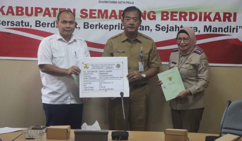 UNGARAN – Pejabat Pembuat Komitmen (PPK) pengadaan tanah jalan tol Yogyakarta-Bawen II, Moh Fajri Nukman menyerahkan uang ganti rugi (UGR) terhadap bidang tanah aset Pemkab…
