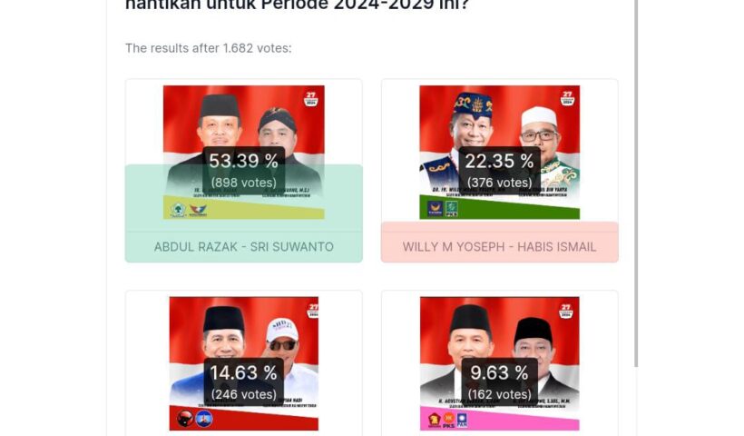 Palangkaraya – Pelitakota.id Pasangan calon gubernur dan calon wakil gubernur Kalimantan Tengah (Kalteng) nomor urut 4, Abdul Razak – Sri Suwanto unggul telak dalam jajak…