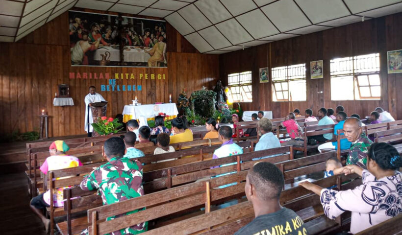 Nduga – Satgas Pamtas Mobile RI-PNG Yonif 503/Mayangkara melaksanakan ibadah minggu Nasrani di Gereja Quasi Paroki Santo Damian bersama warga Batas Batu Kabupaten Nduga Papua.…