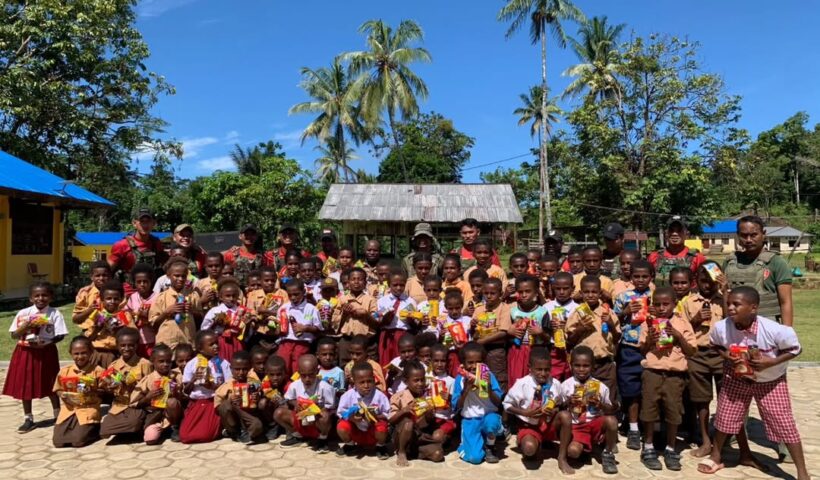 Maybrat – Anak-anak SD di Kampung Ayata, Distrik Aifat, Kabupaten Maybrat, tampak ceria menerima makan siang gratis dari Satgas Yonif 501 Kostrad. Program ini mendukung…