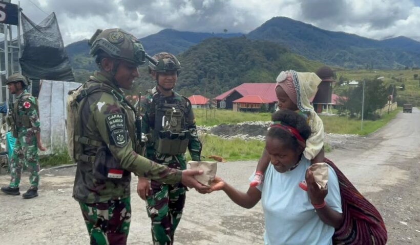 Ilaga – Prajurit Yonif 323 Kostrad menunjukkan kepedulian mereka dengan membagikan makanan kepada warga di Kampung Kago, Distrik Ilaga, Kabupaten Puncak, Papua Tengah, Senin (10/02/2025).…