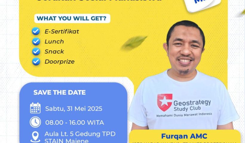 Majene, Sulawesi Barat – Free Palestine Network (FPN) bekerja sama dengan DEMA STAIN Majene akan mengadakan pelatihan “Gerakan Sosial Mahasiswa” pada Sabtu, 31 Mei 2025,…