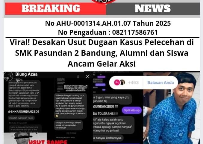 Selengkapnya... Viral! Desakan Usut Dugaan Kasus Pelecehan di SMK Pasundan 2 Bandung, Alumni dan Siswa Ancam Gelar AksiHari: 24 September 2025