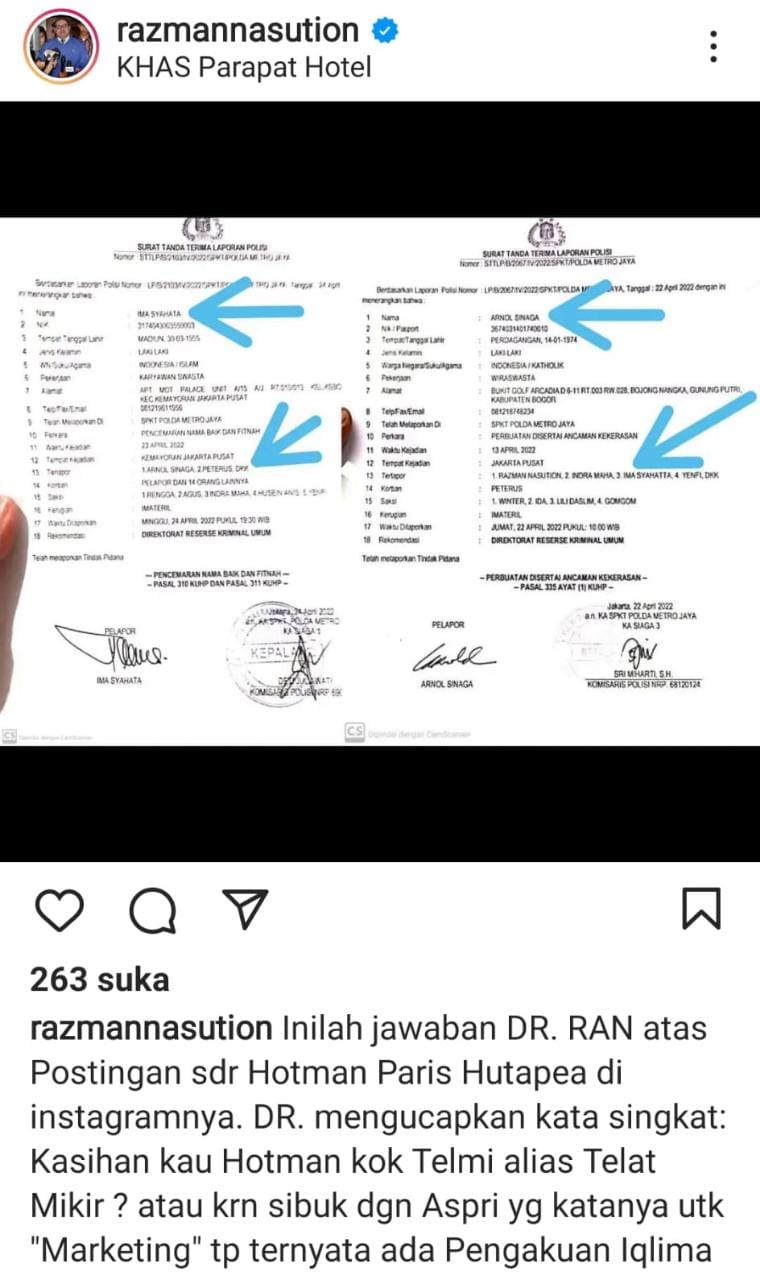 Terkait tanggapan Razman Arif Nasution pada akun instagramnya soal postingan Hotman Paris Hutapea (HPH), Arnol Sinaga dengan tegas menyampaikan bahwa laporannya berbeda dengan 2 peluru polisi itu. Arnol juga menilai bahwa, Bang HPH itu bukan level-nya Razman.