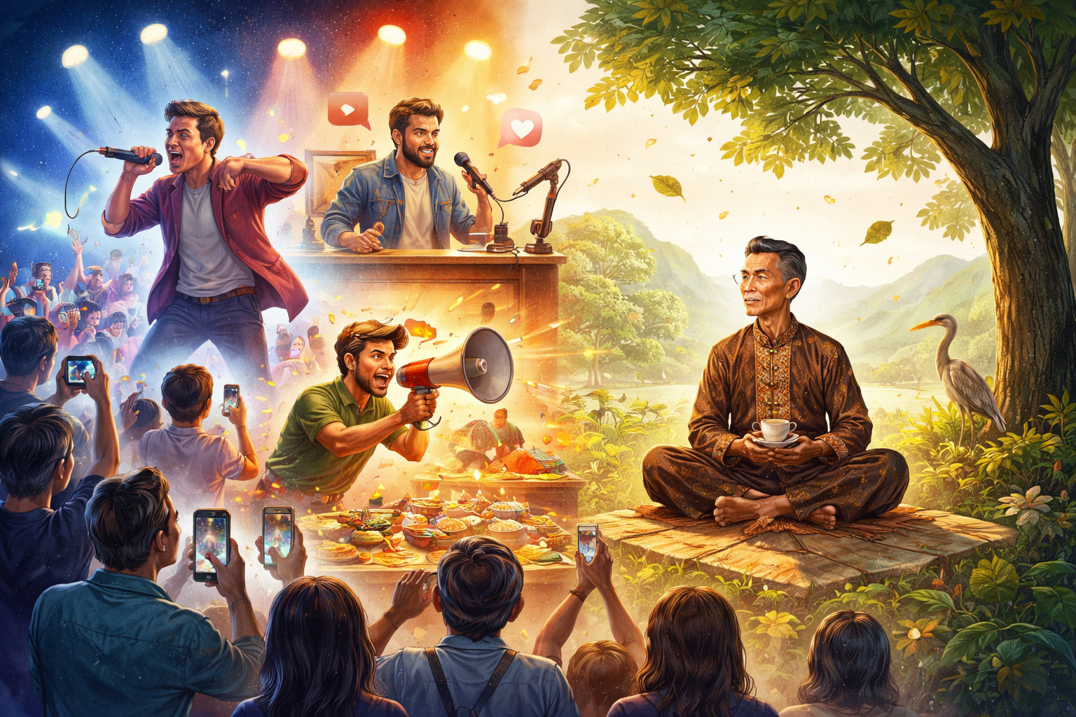 Di zaman ketika linimasa lebih menentukan arah opini dibanding ruang diskusi, kebenaran sering kali kalah oleh kebisingan. Bukan karena ia salah, melainkan karena ia kurang terdengar. Dalam konteks inilah sebuah podcast yang tayang dan ramai diperbincangkan pada awal Januari 2026 menjadi relevan. Di sana, Hasan Nasbi menyampaikan analogi sederhana namun telak ketika membahas Pandji Pragiwaksono: pertunjukan adalah jualan. Semakin kencang, semakin unik, semakin “aneh”, semakin besar peluang mendapatkan atensi. Dan hari ini, atensi adalah mata uang paling mahal.