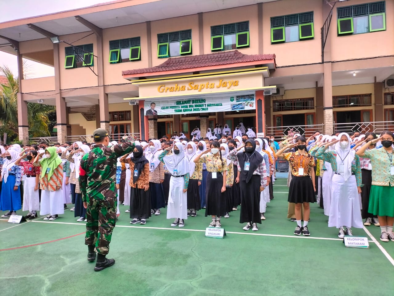 Kali ini Babinsa Kelurahan Tipes Koramil 03/Serengan Kodim 0735/Surakarta Sertu Anjasmoro hadir dalam acara Masa Orentasi Siswa (MOS) yang di laksanakan dengan memberikan materi PBB dan wasbang terhadap Siswa Siswa di Sekolah SMAN 7 Surakarta, Jum’at, pukul 07.30 Wib (15/07/2022)