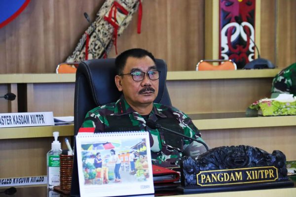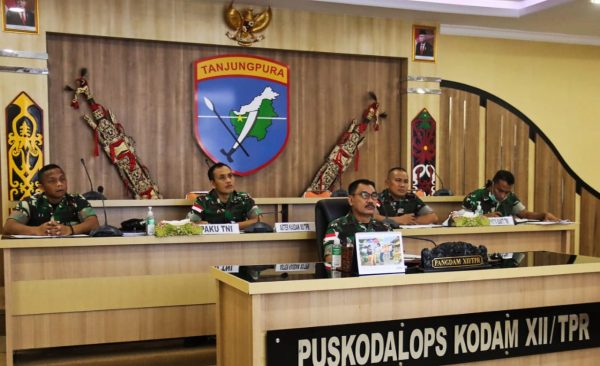 Kubu Raya, Sabtu (16/4/22) – Panglima Kodam XII/Tanjungpura, Mayjen TNI Sulaiman Agusto, S.I.P., M.M., secara video conference (Vicon) mengikuti Rapat membahas persiapan penyaluran bantuan tunai TNI TA 2022 untuk Pedagang Kaki Lima (PKL) dan Warung bertempat di Ruang Rapat Puskodalopsdam XII/Tpr.