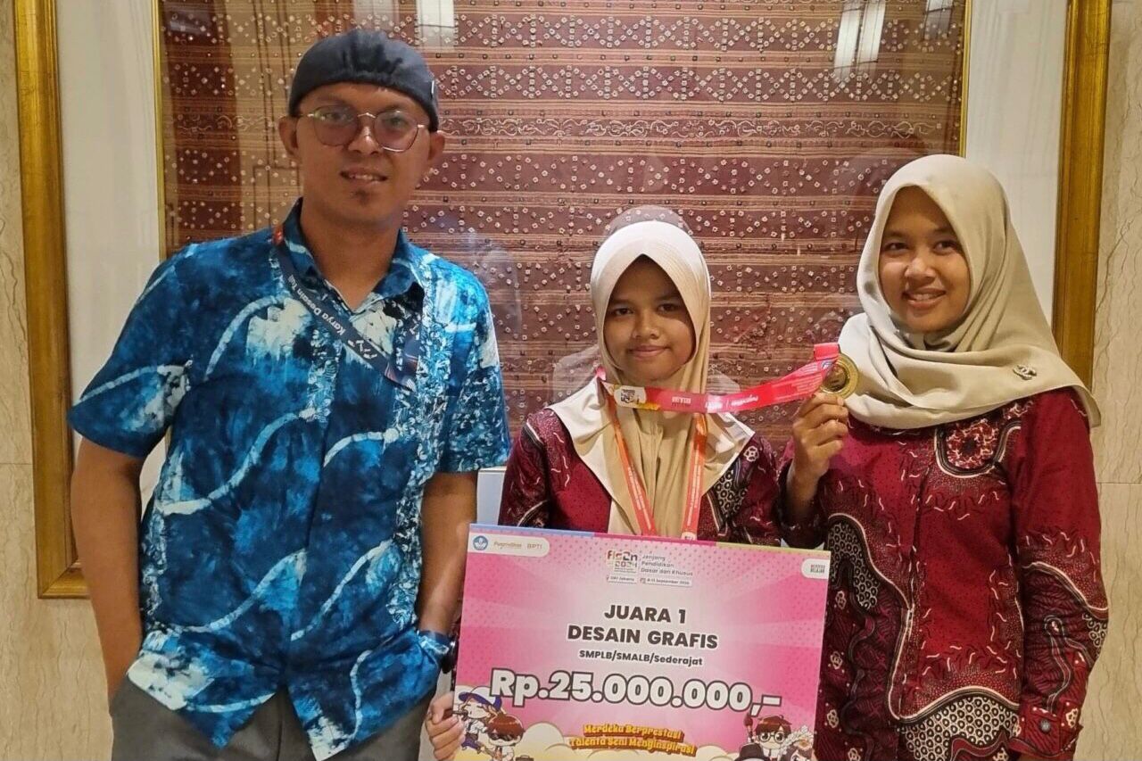 SRAGEN – Yuliana Nur Hafizah (14), siswi tuli SLB Negeri Sragen berhasil mengukir sejarah dengan meraih medali emas pada Lomba Desain Grafis Festival dan Lomba Seni Siswa Nasional jenjang Peserta Didik Berkebutuhan Khusus (FLS2N-PDBK) 2024 untuk kali pertama.