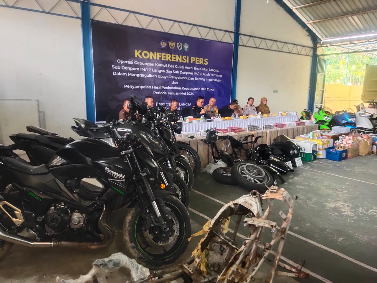 Langsa, Pelitakota.id – Bea Cukai Langsa bersama tim gabungan berhasil mengamankan berupa barang impor ilegal di antaranya 9 sepeda motor merek Triumph Kawasaki, Yamaha, Honda dalam kondisi bekas dan banyak barang lainnya.