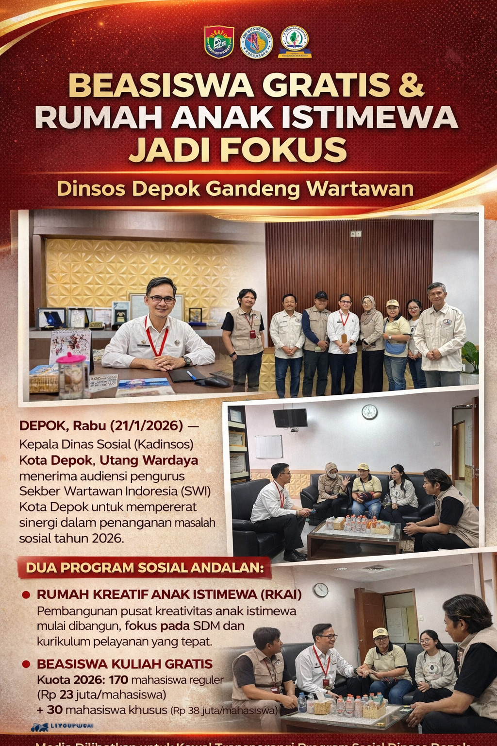 Hal itu terungkap dalam audiensi antara Kepala Dinas Sosial Kota Depok, Utang Wardaya, dengan pengurus Sekber Wartawan Indonesia (SWI) Kota Depok, yang berlangsung di ruang kerja Kadinsos, Rabu (21/1/2026).