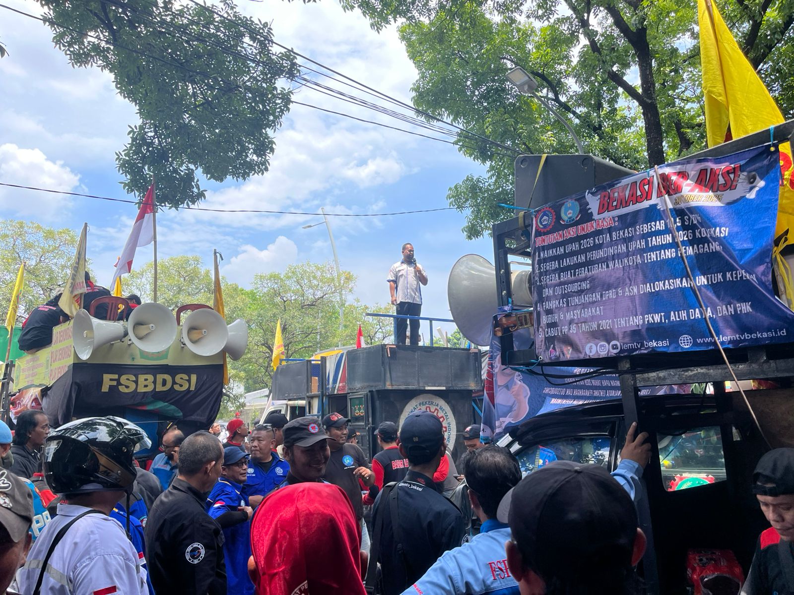 Massa aksi yang terdiri dari berbagai elemen serikat pekerja seperti FSPMI, SGBN, FPBI, SPB, dan SPSI, menyuarakan tuntutan agar Pemerintah Kota Bekasi segera memperjuangkan kenaikan UMK 2026 di kisaran 10 hingga 15 persen.
