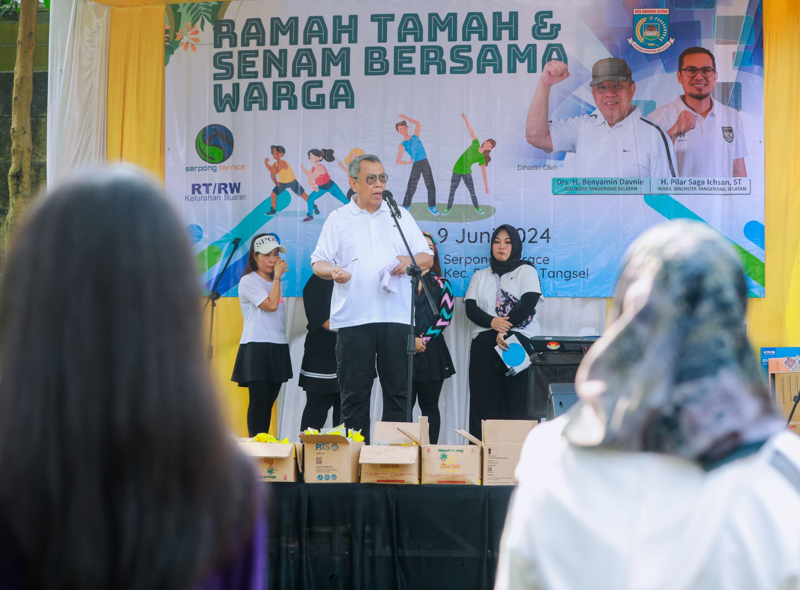 SERPONG- Wali Kota Tangerang Selatan Benyamin Davnie hadir dan ikut bersama ratusan warga memeriahkan acara “Yuk Kita Senam” yang diadakan di Balai Warga RW 09 Perumahan Serpong Terrace, Buaran, Serpong pada Minggu (9/06/2024).