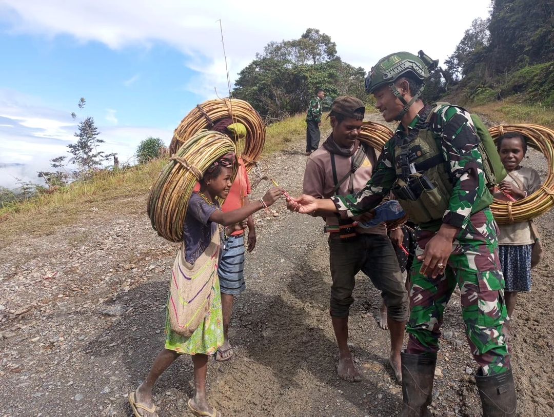 Intan Jaya -Satgas Yonif 509 Kostrad melalui Titik Kuat (TK) Bilogai melaksanakan kegiatan berbagi alas kaki dan program Rosita (Memborong Hasil Tani) kepada masyarakat yang rutin melintas di depan TK Bilogai. Minggu (26/05/2024).