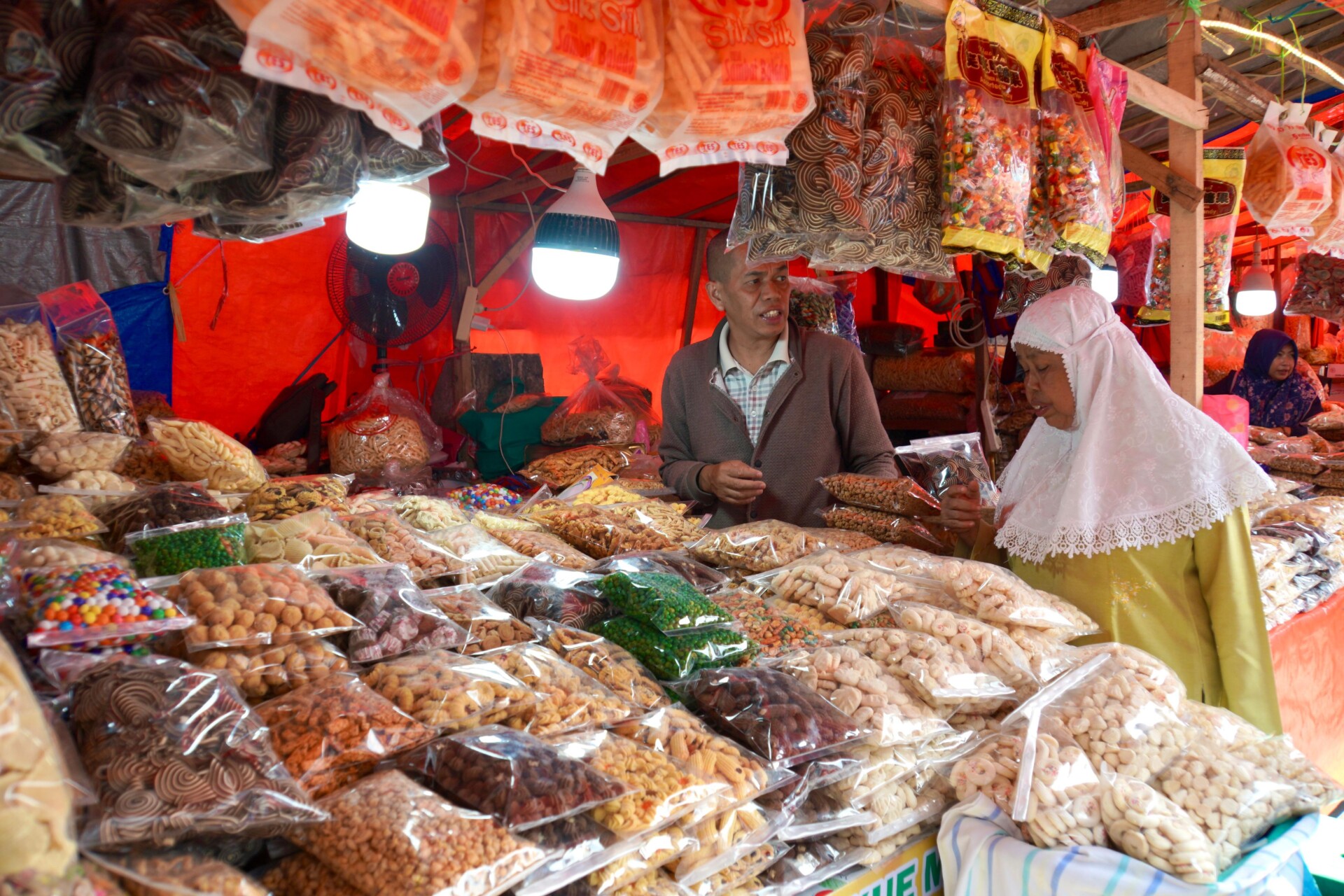 Adapun arai pinang Rp60.000/kg, kacang telur keriting Rp80.000/kg, kacang telur biasa Rp60.000/kg, kacang panggang Rp60.000/kg. Pedagang di lapak tersebut juga menjual kue modern seperti nastar dan lainnya yang umumnya dijual dengan harga Rp80.000/kg.