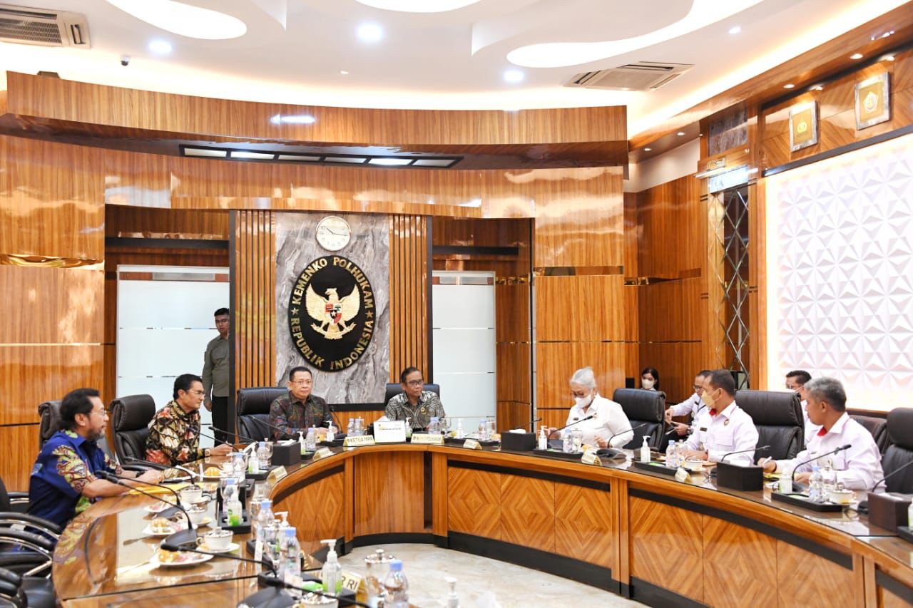 JAKARTA – PK NEWS Ketua MPR RI sekaligus Wakil Ketua Umum Partai Golkar Bambang Soesatyo bersama Wakil Ketua MPR RI Fadel Muhammad dan Ketua MPR RI For Papua (Forum Komunikasi Anggota MPR RI/DPR RI dan DPD RI Daerah Pemilihan Papua dan Papua Barat) Yorrys Raweyai bertemu Menteri Koordinator Bidang Politik Hukum, dan Keamanan (Menko Polhukam) Prof. Mahfud MD di Kantor Kemenko Polhukam. Membahas jalan keluar atas berbagai permasalahan untuk memajukan Papua (Papua, Papua Barat, Papua Selatan, Papua Tengah, Papua Pegunungan, dan Papua Barat Daya).