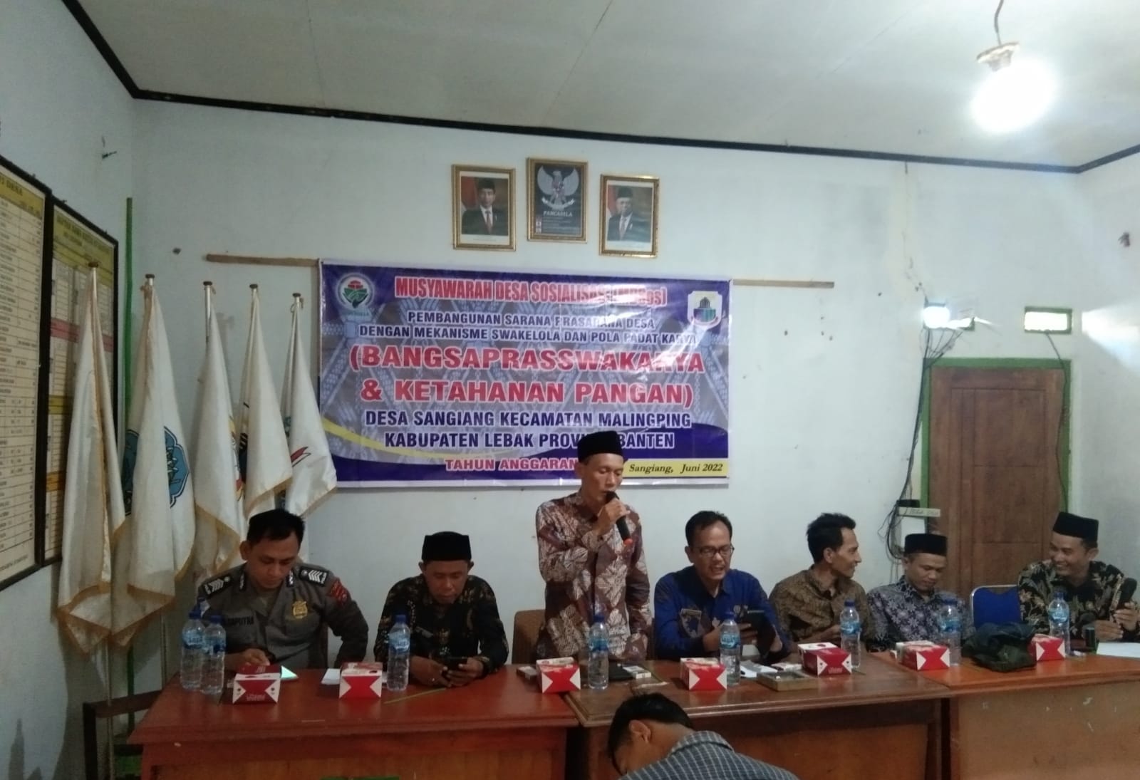 LEBAK, – Bhabinkamtibmas Desa Sanghiang Polsek Malingping Polres Lebak Bripka Deni Saputra menghadiri Musyawarah Desa Sosialisasi (MDsos) dalam rangka Pembangunan Sarana Prasarana Desa dengan Mekanisme Swakelola dan Pola Padat Karya (Bangsap Rasswakarya dan Ketahanan Pangan) Tahun 2022 di Kantor Desa Sanghiang Kecamatan Malingping Kabupaten Lebak Provinsi Banten, Kamis (2/6/2022).