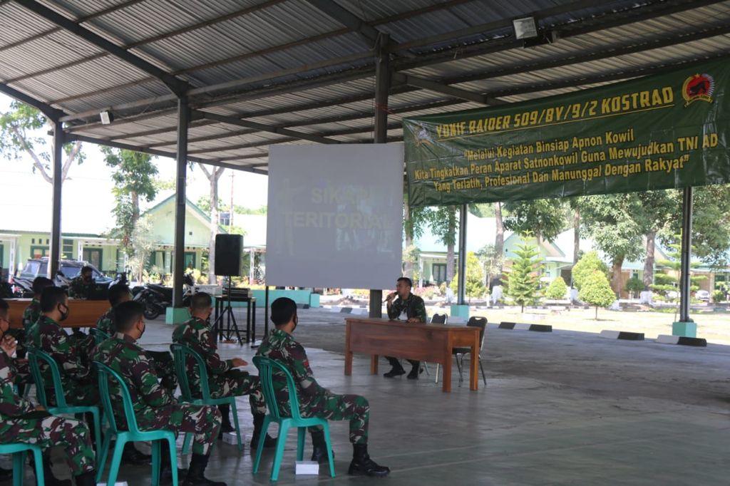 Danyonif Raider 509 Kostrad Letkol Inf Syafrinaldi,S.E. menyampaikan, bahwa tujuan dari pada pelaksanaan Binsiap Apnon Kowil ini untuk menyiapkan aparat satuan non kowil dalam melaksanakan tugas Pembinaan Teritorial (Binter) untuk memelihara dan meningkatkan sumber daya dan kesiapan prajurit dalam pelaksanaan pembinaan dan pemberdayaan wilayah pertahanan Binter terbatas satuan. (Pen).