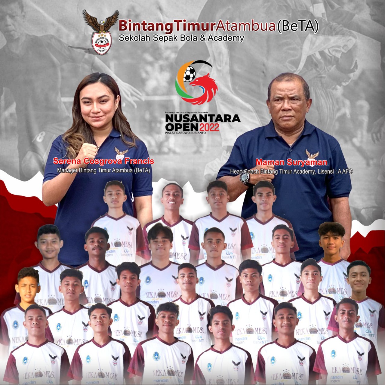 Rena juga menyampaikan terima kasih kepada Prabowo Subiantianto yang telah memberikan kesempatan kepada anak-anak perbatasan untuk bermain di Turnamen Nusantara Open. Dari 70 tim peserta yang mendaftar, 16 tim berhasil lolos termasuk BeTA Atambua.