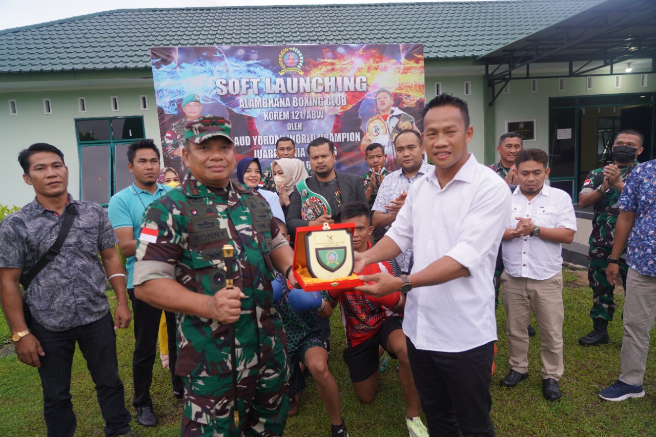 Danrem 121/Abw juga menyerahkan plakat sebagai bentuk penghargaan atas kedatangan petinju kelas dunia ke Makorem 121/Abw.