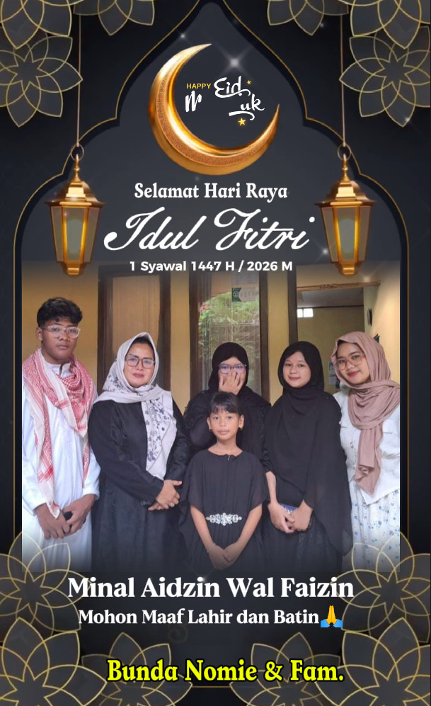 Lebih lanjut Bunda Nomie bersama keluarga mengucapkan” Selamat Hari Raya Idul Fitri 1447.H” Mohon Maaf Lahir dan Batin, dengan hati yang tulus saya pribadi bersama pengurus menyampaikan mohon maaf atas segala kesalahan yang pernah terjadi.