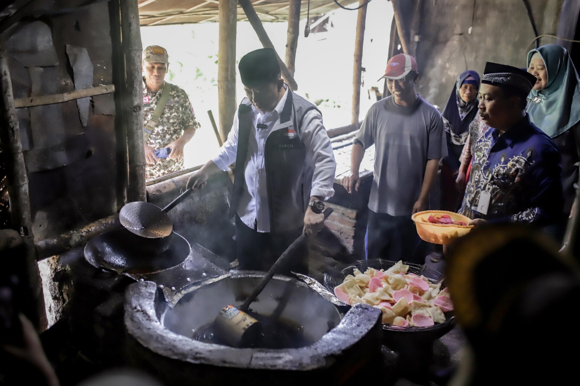 Saat berada di sentra produksi kerupuk tersebut, Bupati Hendy mencoba untuk menggoreng sendiri kerupuk.