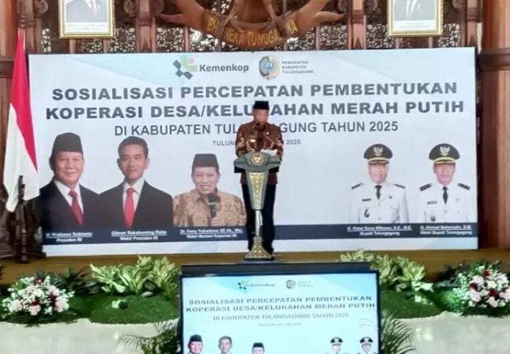 Tulungagung,pelitakota.id- Bupati Tulungagung, Gatut Sunu Wibowo, menargetkan pendirian 271 Koperasi Merah Putih di seluruh desa dan kelurahan di Kabupaten Tulungagung pada tahun 2025. Target ini disampaikan dalam acara Sosialisasi Percepatan Pembentukan Koperasi Merah Putih yang dihadiri Wakil Bupati Ahmad Baharudin, para kades/lurah, camat, dan OPD terkait di Pendopo Kongas Arum Kusumaning Bongso pada Jumat (2/5/2025).