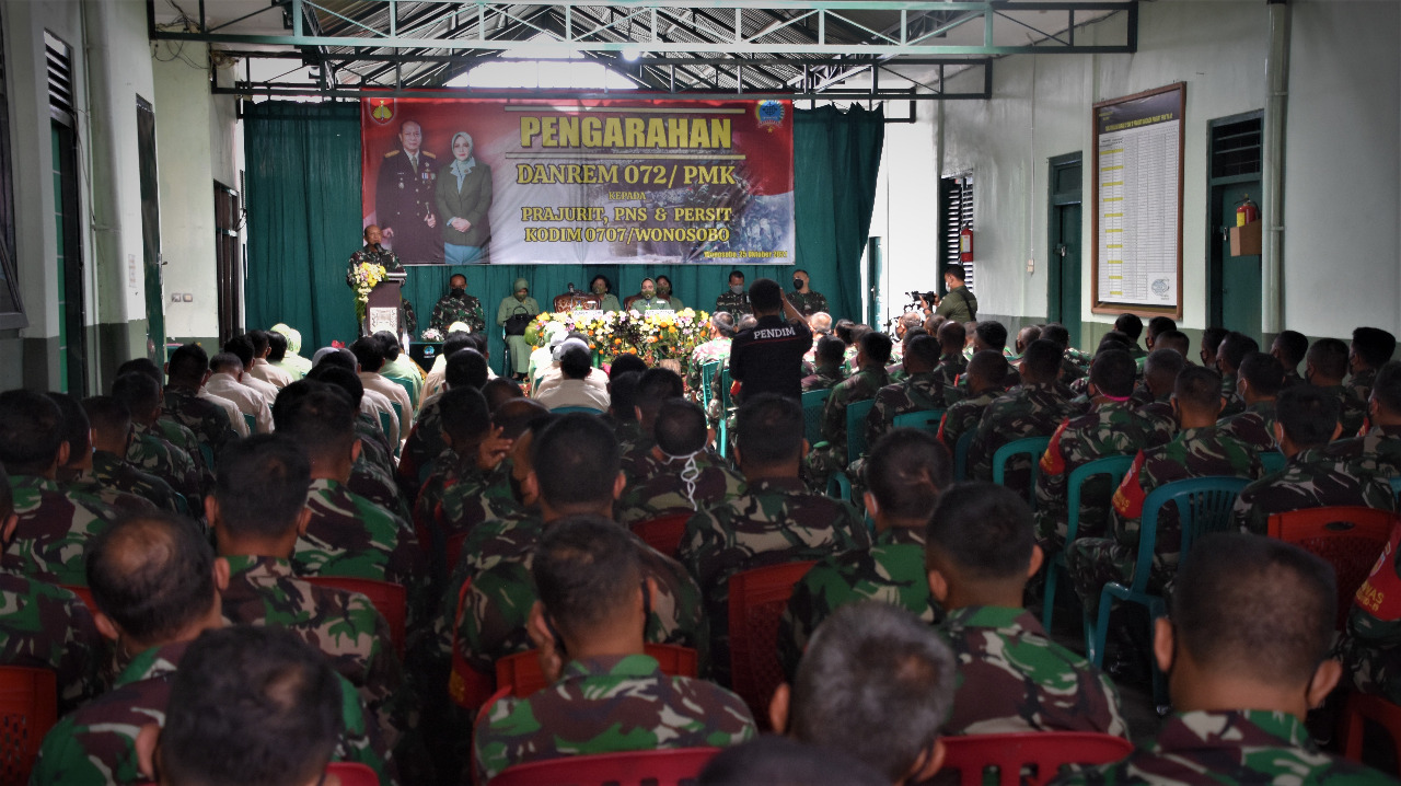 Danrem 072/Pmk dalam pengarahan kepada Prajurit, PNS dan Persit Kodim 0707/Wonosobo, memberikan apresiasi kepada seluruh anggota Kodim 0707/Wonosobo yang mana dalam pelaksanaan tugas penanganan Covid 19 di wilayah Wonosobo cukup baik, terbukti sinergisitas TNI, Polri dan Pemda Wonosobo berjalan dengan lancar dengan situasi yang kondusip.