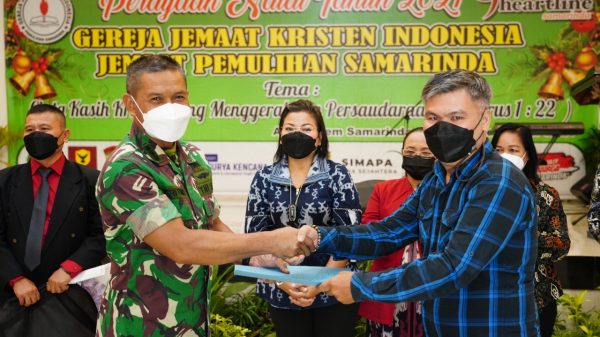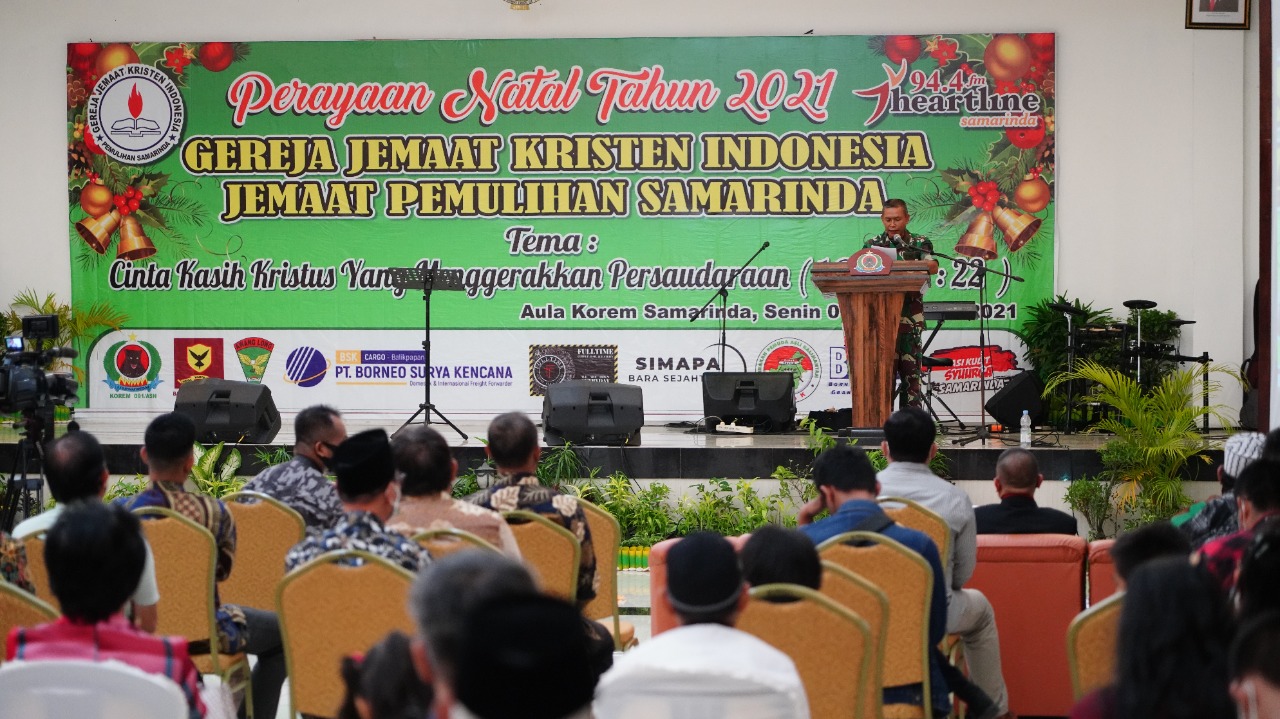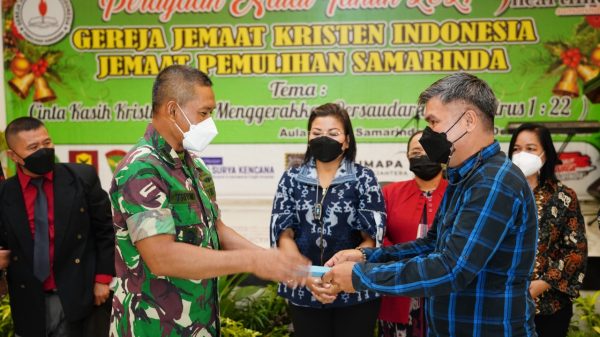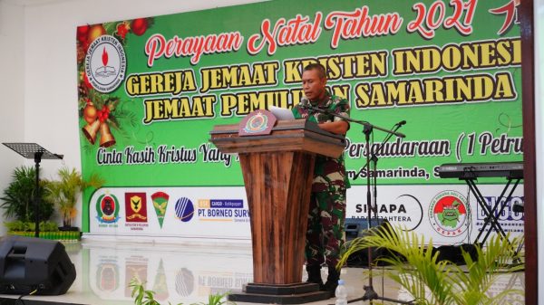 SAMARINDA – PELITAKOTA.ID Kasrem 091/ASN Kolonel Inf Triyono S. Sos, menghadiri Perayaan Natal Gereja Jemaat Kristen Indonesia Jemaat Pemulihan Samarinda dengan Tema “Cinta Kasih Kristus Menggerakkan Persaudaraan”.Bertempat di Aula Wira Yudha Makorem 091/Aji Surya Natakesuma Jalan Gajah Mada, Senin (6/12/2021) malam.
