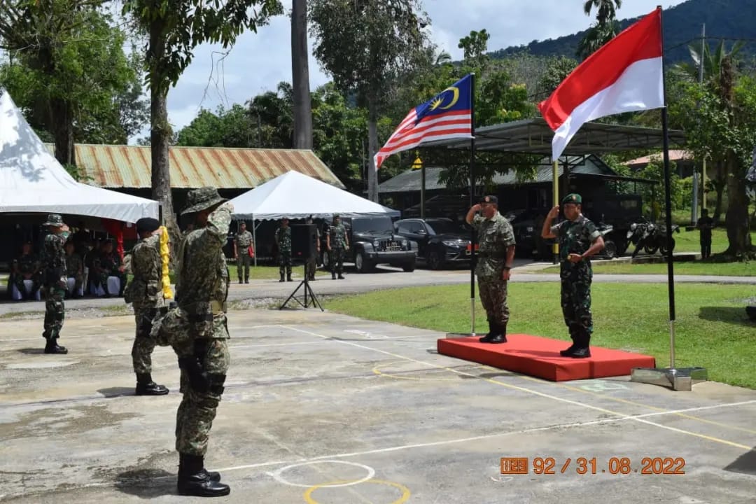 Sarawak, Rabu (31/8/22) – Komandan Korem 121/Alambhana Wanawwai, Brigjen TNI Pribadi Jatmiko bersama Panglima 3 Brigade Tentera Darat Diraja Malaysia (TDM) Brigjen Mohd kamil bin Hj Abdul Latiff menutup kegiatan Patroli Terkoordinasi (Patkor) Seri 1 tahun 2022 di Pos Gabma Biawak, Sarawak, Malaysia.