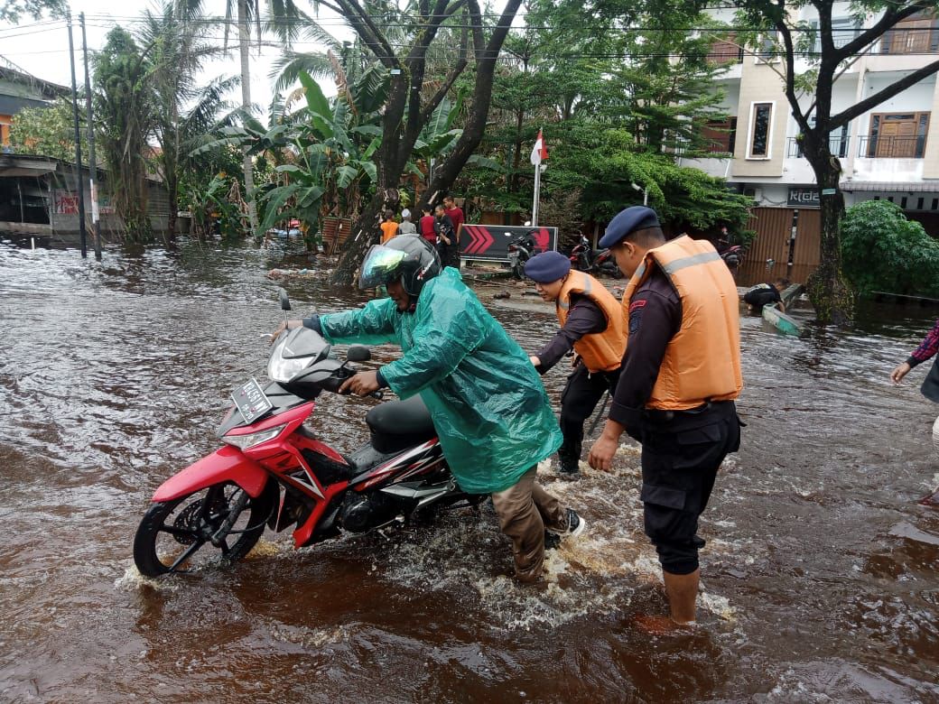 Kami datang untuk membantu masyarakat yang terkena dampak banjir saat berpergian agar tidak salah dalam mengendarai motor kejalur yang aman,” ucap Dantim SAR Ipda Bujang Waluyo.