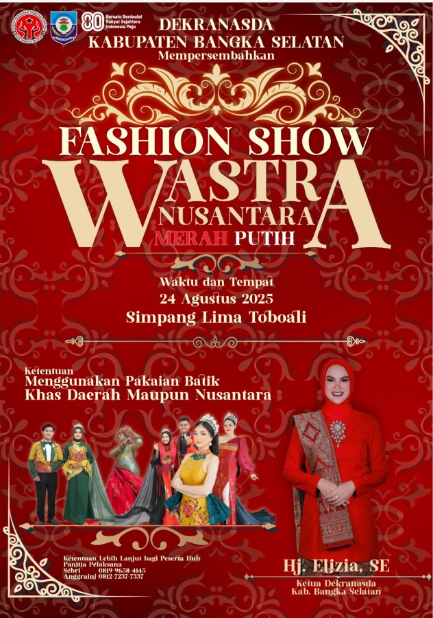 - Expo Merah Putih Dekranasda Basel 2025: Temukan produk-produk unggulan khas daerah dari pelaku UMKM lokal dan nikmati suasana kemeriahan HUT RI ke-80. Expo ini akan menampilkan berbagai produk kerajinan, makanan, dan minuman khas Bangka Selatan.