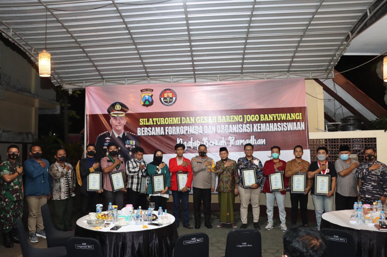 Kapolresta Banyuwangi dalam sambutannya menyampaikan bahwa kegiatan ini dilaksanakan dalam rangka silaturohim dan membangun sinergitas antara Forpimda Banyuwangi dengan elemen mahasiswa di Kabupaten Banyuwangi untuk bersama menjaga Kabupaten Banyuwangi.