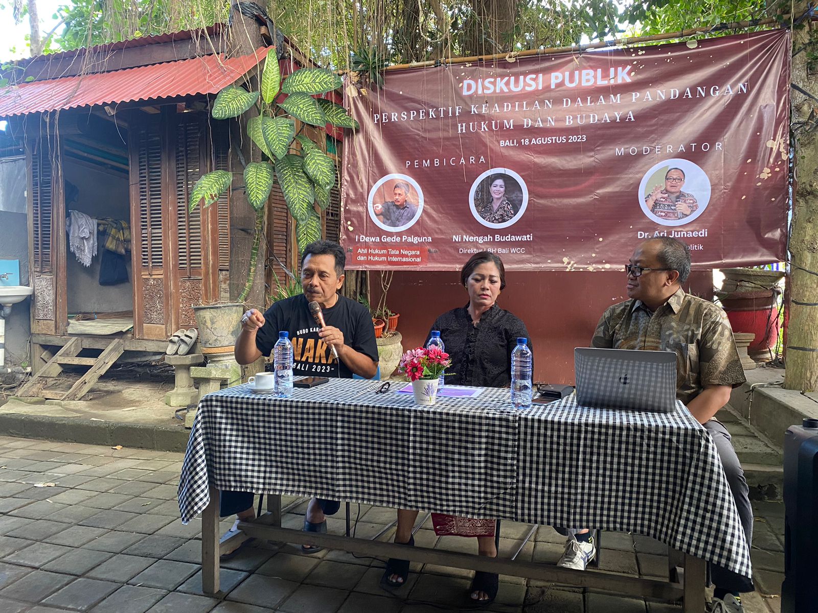 Diskusi Publik Nusakom Pratama Institut bertajuk “Perspektif Keadilan Dalam Pandangan Hukum dan Budaya” digelar di Kubu Kopi, Denpasar, Bali (Jumat, 18 Agustus 2023) dengan menghadirkan Dr. I Dewa Gede Palguna, Hakim Konstitusi periode 2003-2008 dan 2015-2020, pengamat budaya yang juga Direktur LBH Bali Woman Crisis Center, Ni Nengah Budawati serta pengamat politik Dr Ari Junaedi selaku moderator.