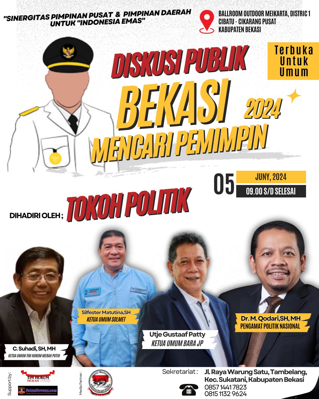 Bekasi – Jabar ||pelitakota.id Acara Diskusi Publik dengan tema “Mencari Pemimpin Bekasi” yang akan diadakan pada 5 Juni 2024 di Distric 1 Maikarta telah menarik perhatian publik.
