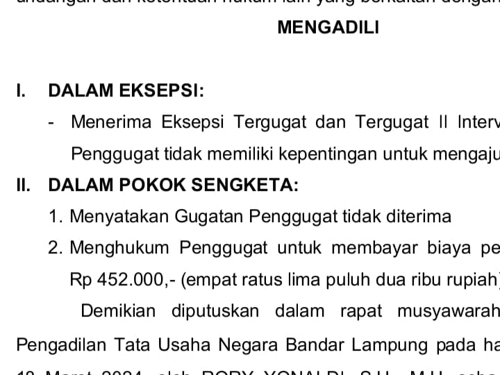 Pasalnya perkara dugaan mengenai Ijazah palsu yang dahulu pernah diajukan oleh Sdr.Sriyadi ke pengadilan Tata Usaha Bandar Lampung dengan nomor perkara 38/G/2003/PTUN.BL dengan Putusan Amar Putusan “Menyatakan Gugatan Penggugat Tidak Dapat Diterima”.