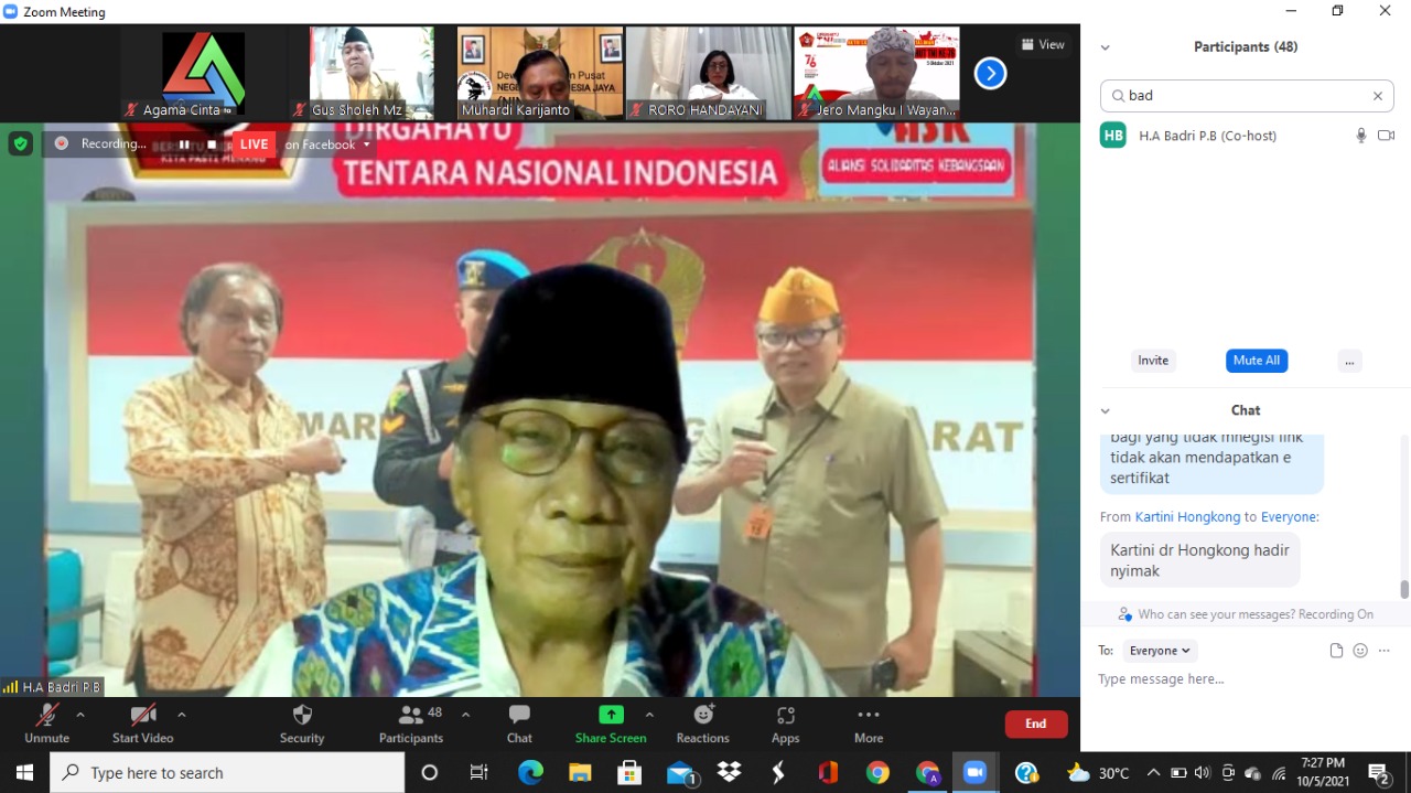 Untuk lajunya acara inti, dipandu Moderator Webinar, Muhardi Karijanto, SE, MM, Sekjen DPP NINJA. Menyampaikan sekilas TNI dari rakyat, oleh rakyat, untuk rakyat, awalnya dibangun oleh para pemuda, berbentuk Tentara Keamanan Rakyat (TKR) jadi TRI, cikal bakal TNI yang diperingati setiap 5 Oktober.