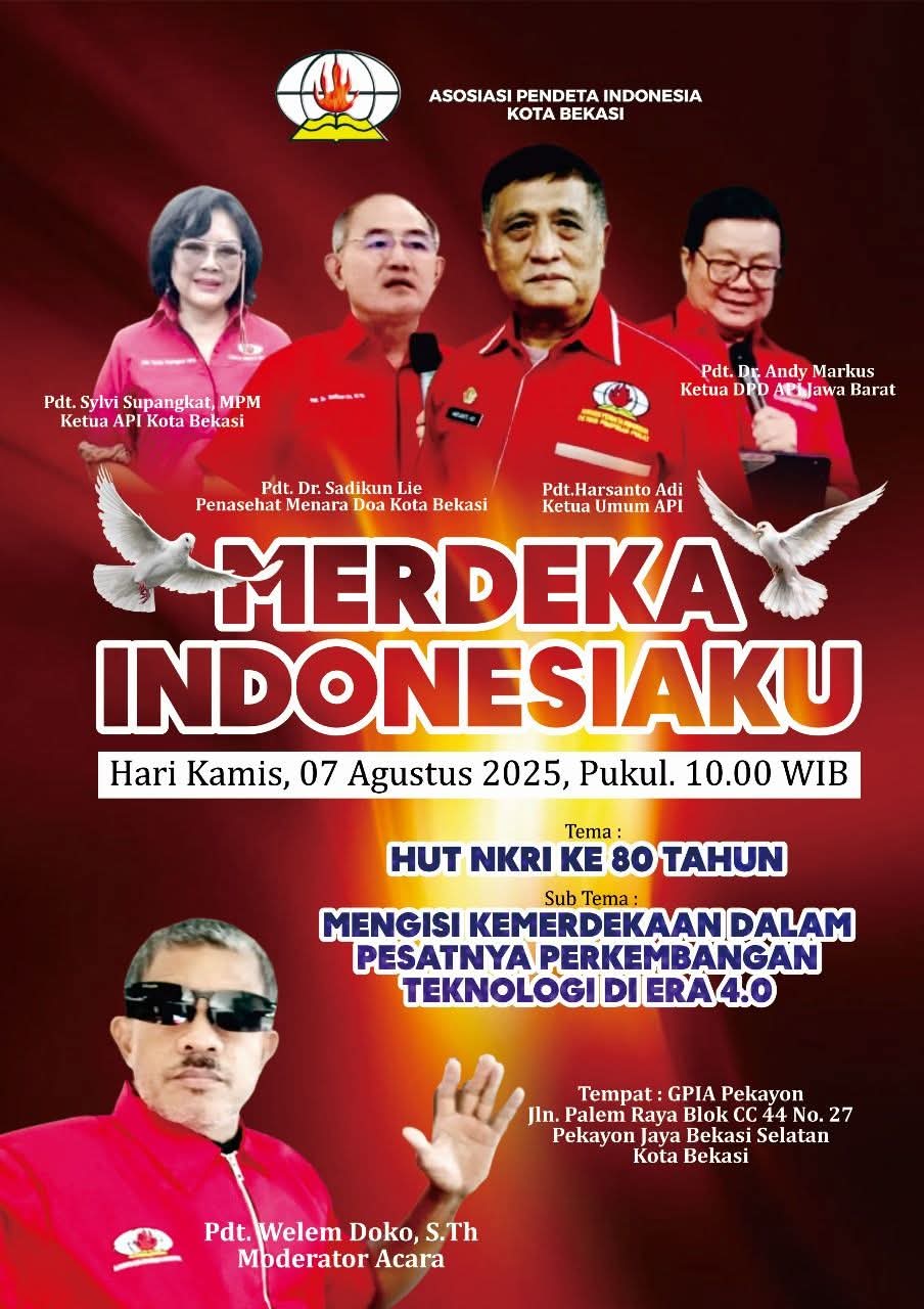 Kota Bekasi,07 Agustus 2025 – Dalam rangka memperingati Hari Kemerdekaan Indonesia ke-80, DPC Asosiasi Pendeta Indonesia (API) Kota Bekasi menggelar seminar “Merdeka Indonesiaku” pada 7 Agustus 2025 di GPIA Pekayon, yang berlokasi di Jl. Pekayon Jaya No. 1, Pekayon Jaya, Bekasi Selatan, Kota Bekasi, Jawa Barat. Acara ini menjadi ajang bagi ratusan pendeta, majelis, penatua, dan diaken dari berbagai gereja di Kota Bekasi untuk berkumpul dan membahas tema “Merdeka Indonesiaku” dengan sub tema “Mengisi Kemerdekaan dalam Pesatnya Perkembangan Teknologi di Era 4.0”.