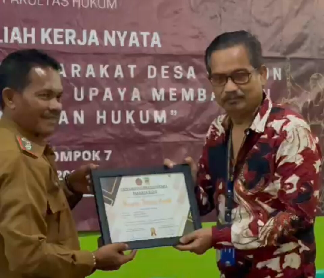 Acara ditutup dengan pemberian Pelakat sebagai cinderamata oleh Kepala Desa Mangun Jaya Jayadi Said kepada Dosen Pembimbing Lapangan Dr.Dwi Seno Wijanarko, SH.,M.H.,CPCLE.,CPA., CPM dan foto bersama serta ramah tamah.