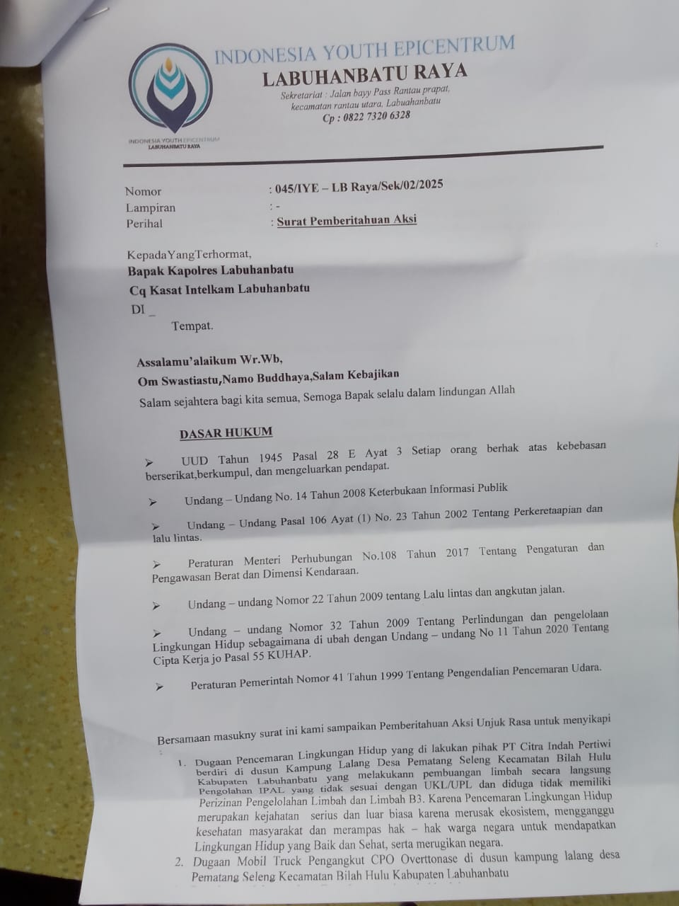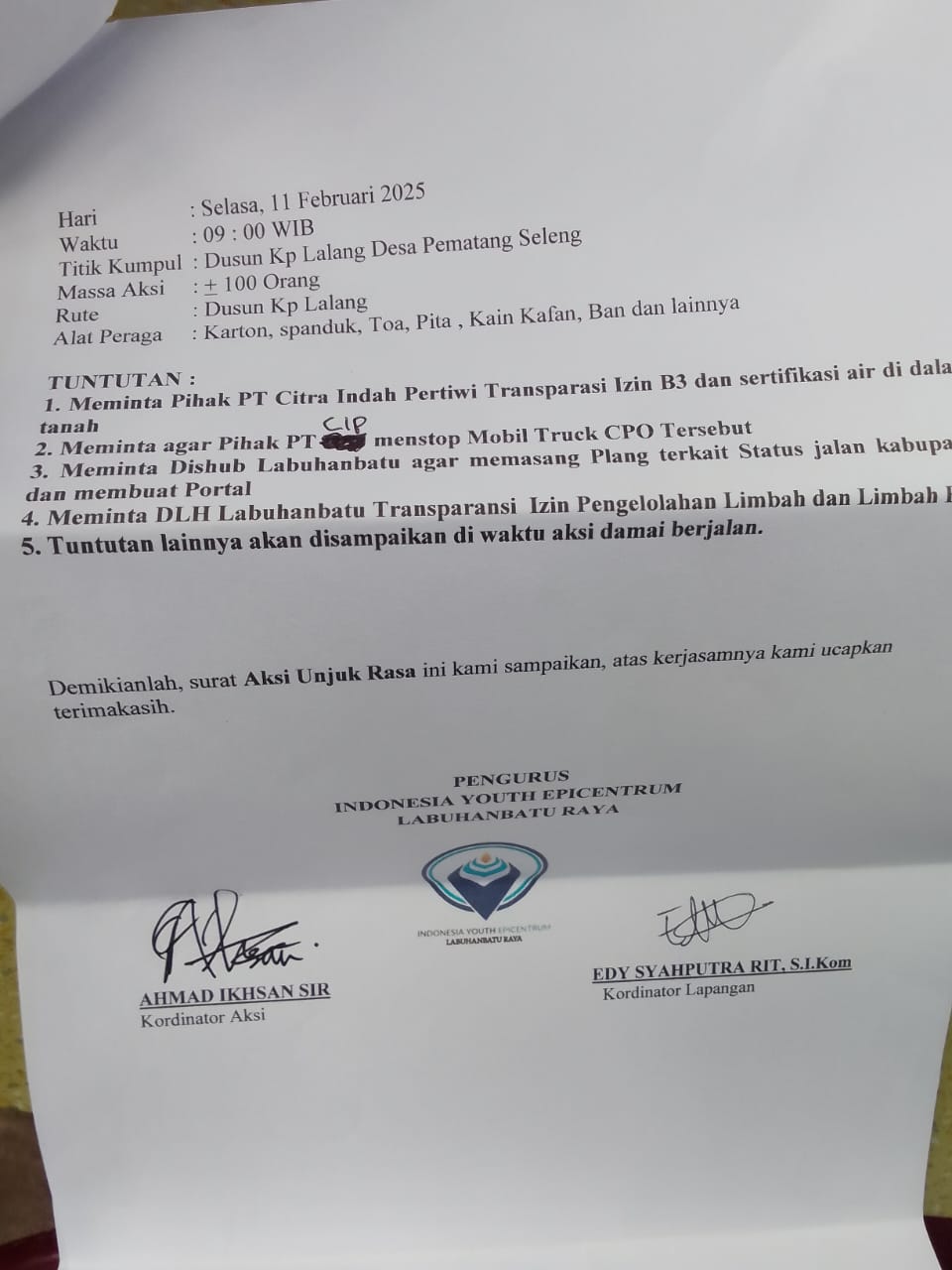 “Kami memohon kepada Dinas Perhubungan untuk transparan terkait izin lalu lintas trus muatan yang melebihi kapasitas melewati kawasan rumah masyarakat Kampung Lestari ke PT PMKS Indo Sepadan Jaya yang diduga tidak memiliki izin,” tegasnya.