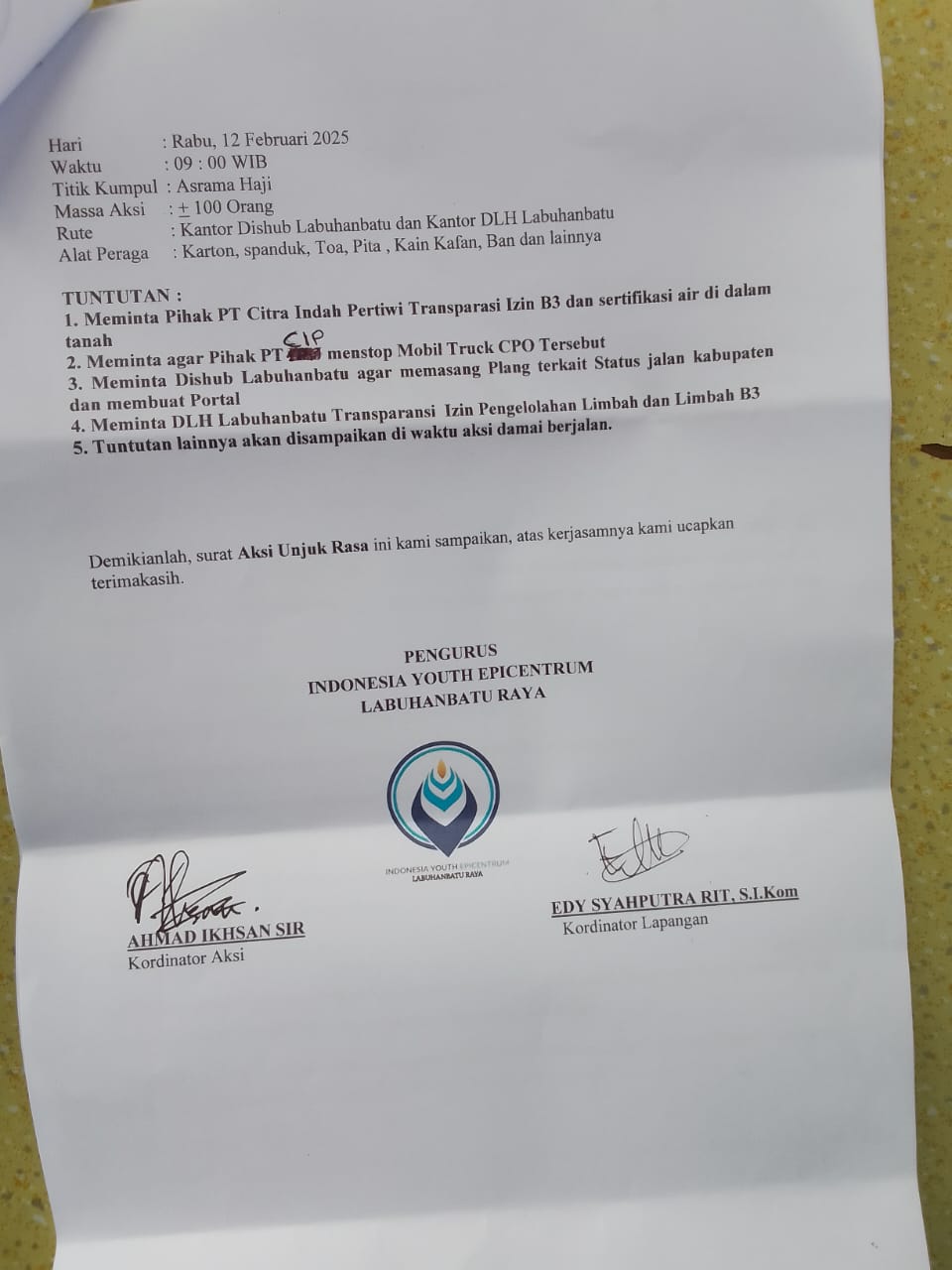 Kami meminta kepada Dinas Perhubungan untuk mendesak pihak PT PMKS Indo Sepadan Jaya untuk membuat jalan sendiri untun dilalui pengangkut CPO dan inti kelapa sawitnya dikarenakan jalan yang dipakai adalah jalan yang dibangun dari uang negara dan harusnya tidak untuk dilalui pengangkut CPO kelapa sawit miliki PT PMKS Indo Sepadan Jaya.