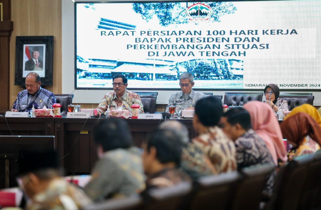 SEMARANG – Pemerintah Provinsi (Pemprov) Jawa Tengah (Jateng) mengadakan Rapat Persiapan 100 Hari Kerja Presiden, dalam rangka mendukung program pemerintah yang baru, di bawah kepemimpinan Presiden RI Prabowo Subianto.