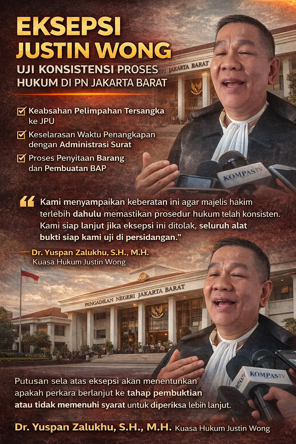“Kami menghormati proses persidangan. Eksepsi ini kami ajukan agar majelis hakim terlebih dahulu menilai apakah prosedur penyidikan dan pelimpahan perkara sudah sesuai aturan. Ini menyangkut hak terdakwa,” ujar Yuspan.