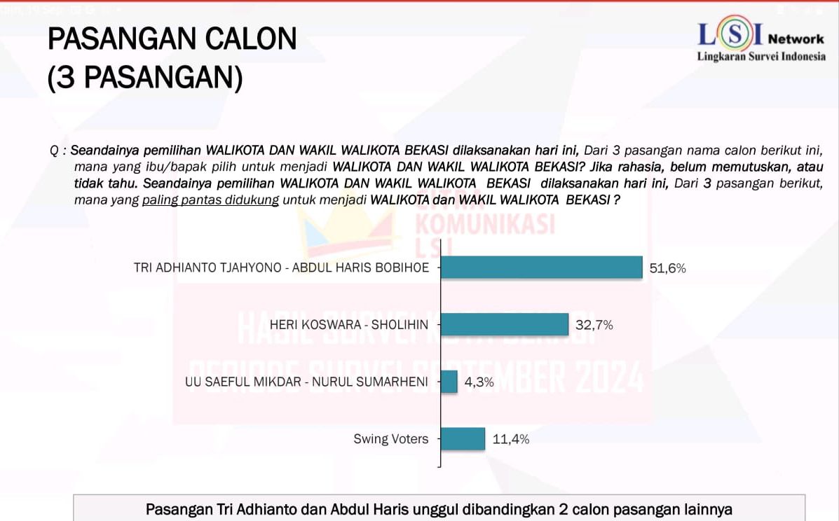 Yaitu, pada survei Mei 2024, Tri 35,2%, sekarang melesat ke 51,6%. Dalam simulasi pasanganpun, Tri Adhianto – Harris Bobihoe (RIDHO), elektabilitasnya kurang lebih sama, 51,6%.